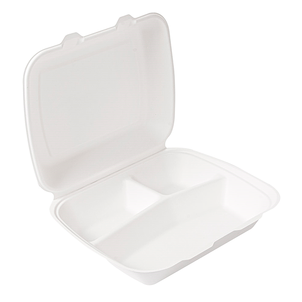 EL Caixa em Bagaço 3 Divisórias com tampa incorporada é a solução prática para servir, embalar e transportar refeições completas com responsabilidade ambiental. Porque resulta de fibras vegetais, é naturalmente resistente e leve. Além disso, apresenta um acabamento branco limpo que valoriza a apresentação dos alimentos no take-away, em cantinas, em eventos e em serviços de catering.