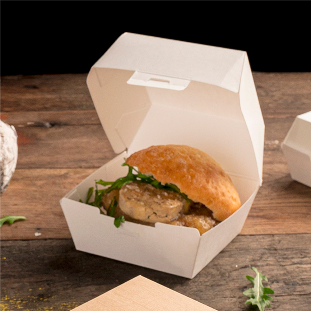 Caixa hambúrguer cartão nano-micro branco 14,4×13,6 cm: leve e resistente, com fecho rápido e empilhamento estável. Ideal para takeaway e delivery, própria para contacto alimentar e reciclável.