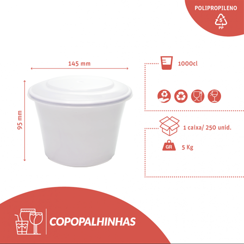 Capacidad: 1 L (1000 ml). Incluye vaso y tapa. Color: blanco. Material: polipropileno apto para uso alimentario. Usos: ensaladas, sopas, pastas, frutas, etc. puesta en marcha y entrega. Beneficios: cierre seguro, apilado estable, dosificación precisa, presentación higiénica y operación ágil. En conclusión, este Envase de PP blanco de 1L Mejora los procesos, reduce el desperdicio y eleva la experiencia del cliente desde el mostrador hasta la mesa. Ver más Embalaje.