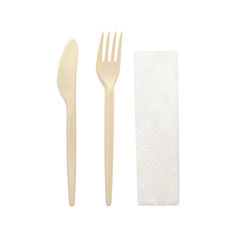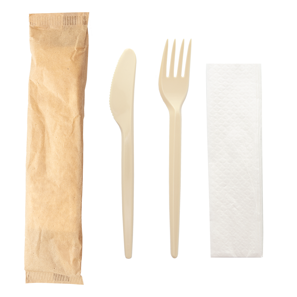 KIT DE CUCHILLO Y TENEDOR REUTILIZABLES CON SERVILLETA EN PAQUETE DE PAPEL (ENVASADO INDIVIDUALMENTE)
