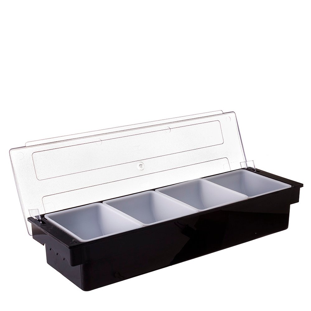 Medidas externas: 49,5 × 15,5 × 9,5 cm (aprox.). Divisórias: 4 cubas removíveis. Aplicaciones: guarnições de cocktails, toppings de sobremesas, molhos frios, saquetas, especiarias e pequenos ingredientes de mise en place.
