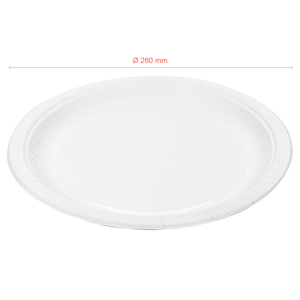 Diámetro: 26 cm. Color: blanco. Material: papel/cartão. Tipo: desechable. Propiedades: resistente a óleos e humidade; uso típico entre 0–70 ºC; apto para contacto alimentar; reciclável; compostável EN 13432.