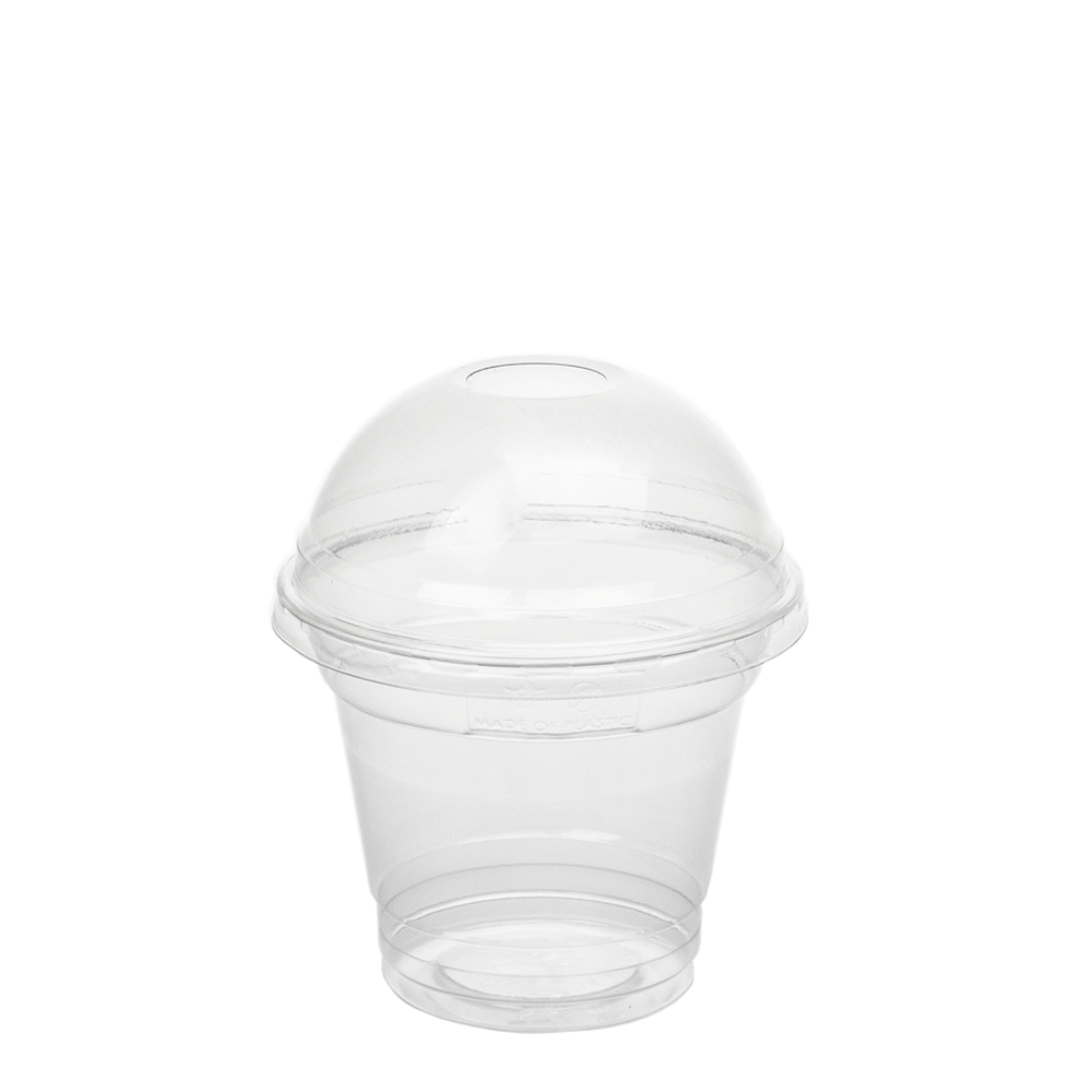 El vaso PET de 24 cl (240 ml/8 oz) con tapa alta y orificio combina practicidad, durabilidad y estilo. Su forma transparente realza al instante el color y la textura de las bebidas, haciendo que cada porción sea más atractiva. Además, su acabado cristalino transmite una imagen moderna y profesional.