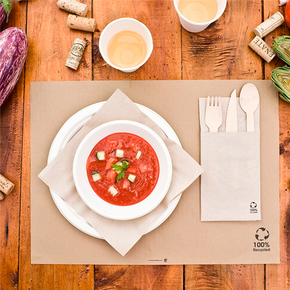 A gramagem adequada confere boa resistência ao manuseamento, enquanto a textura natural cria um aspeto acolhedor e moderno. Deste modo, os toalhetes mesa reciclados respondem às exigências de limpeza e, simultaneamente, valorizam a decoração. As tintas de impressão são à base de água; portanto, mais seguras para ambientes de restauração.
