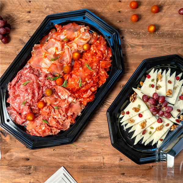 A base preta cria contraste com sushi, sandes, enchidos, queijos, salgados, mini sobremesas e tábuas frias. Assim, os alimentos ganham profundidade de cor e parecem mais frescos no momento da entrega. Em simultâneo, a tampa lisa permite colocar autocolantes, rótulos e QR codes sem perder visibilidade do conteúdo.