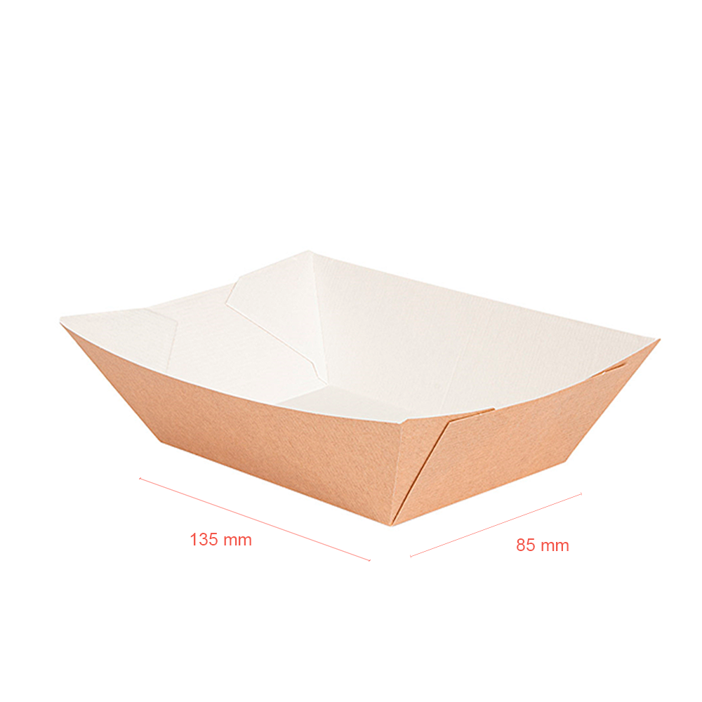 Dimensões: 13,5 x 8,5 cm. Material: cartão ondulado nano-micro. Cor: natural. Tipo: descartável, reciclável. Propriedades: resistente a óleos e gorduras; apta para contacto alimentar; intervalo de utilização −18 ºC a +70 ºC; apta para micro-ondas (curta duração); não apta para forno. Aplicações: petiscos, batatas fritas, salgados, doces, porções individuais, finger food e degustações.