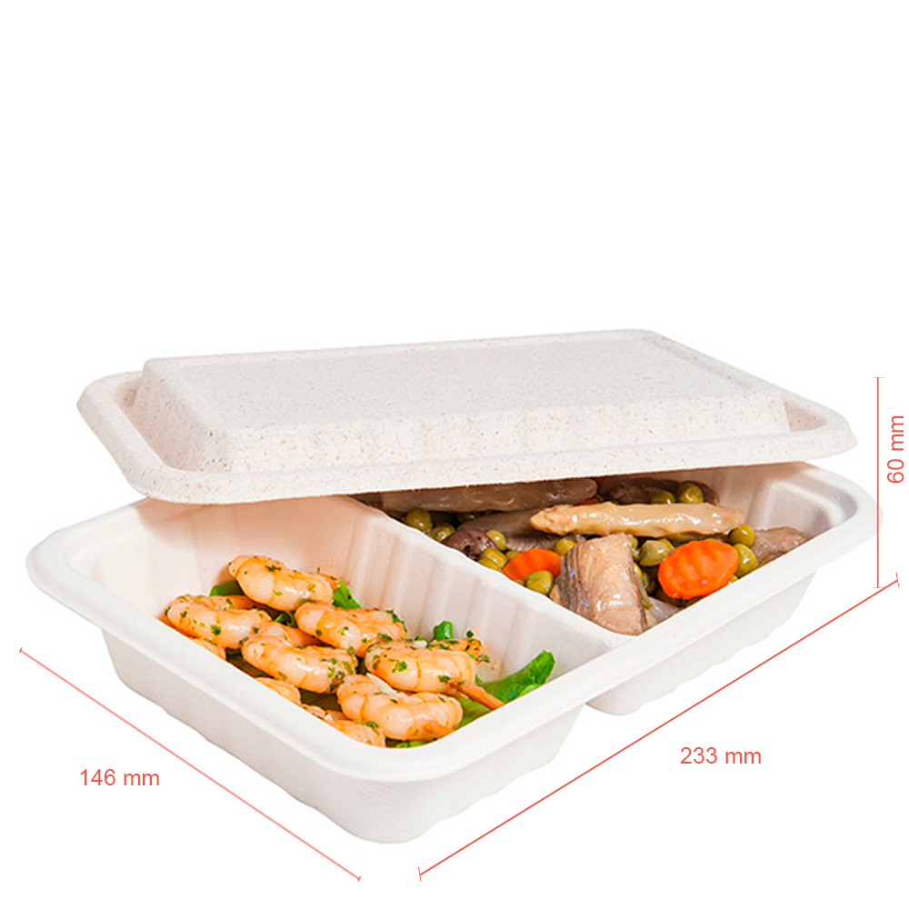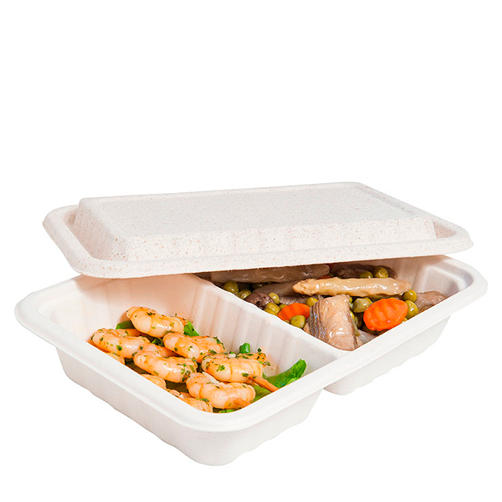 A divisória cria áreas independentes; assim, colocas proteína de um lado e acompanhamentos do outro. Como resultado, evitas misturas indesejadas e entregas um prato visualmente apelativo. Por isso, a embalagem de bagaço funciona muito bem em menus do dia, saladas compostas, bowls quentes, grelhados e combinações frias.