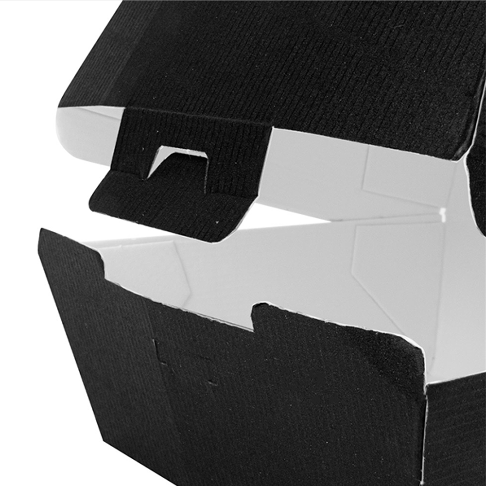 A caixa hambúrguer cartão em ondulado nano-micro, no acabamento preto, oferece apresentação premium e logística eficiente para takeaway e delivery. Assim, protege o produto, valoriza o aspeto e facilita um serviço rápido.