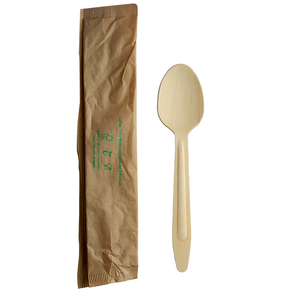 Colher de Madeira 16 cm com Embalagem Individual em Papel