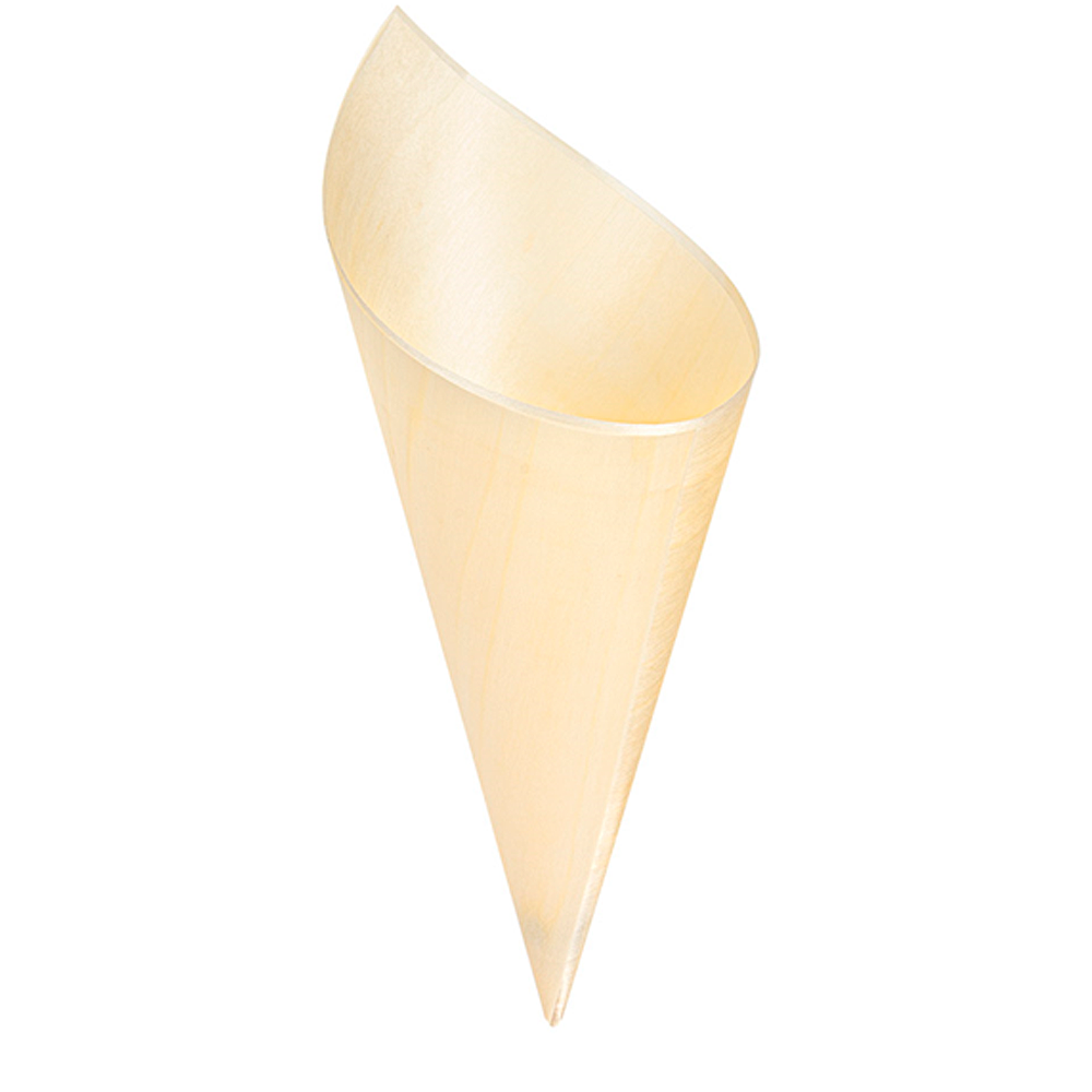 Fabricado a partir de casca de pinheiro cuidadosamente selecionada, este cone utiliza um recurso de origem natural, leve e resistente. Por um lado, a textura da madeira confere caráter e autenticidade à apresentação. Por outro, a superfície interna lisa ajuda a manter a higiene e o conforto no consumo. Além disso, o material é biodegradável e compostável (referência informativa à EN 13432), o que contribui para uma gestão de resíduos mais responsável.