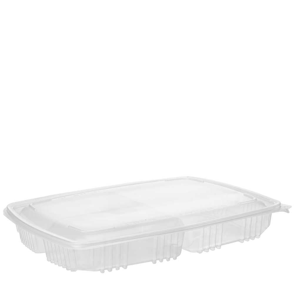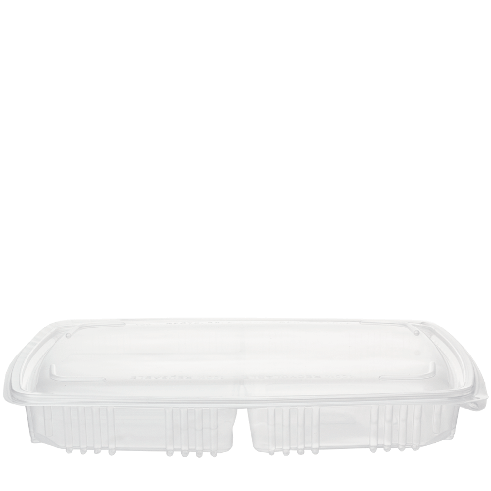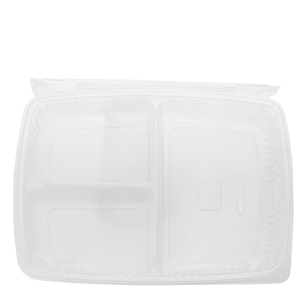 Embalagem em PP com 3 divisórias, feita em polipropileno resistente, 100% reciclável e reutilizável. Possui tampa presa à base e fecho seguro, sendo empilhável e ideal para refeições completas em takeaway, catering e delivery. Medidas: 220 x 297 x 50 mm. Apto para micro-ondas.