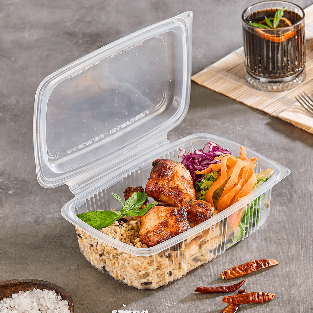 Fabricada em plástico resistente e atóxico, é totalmente segura para contacto com alimentos quentes ou frios. Graças à sua durabilidade, pode ser reutilizada várias vezes sem perder a integridade. Por outro lado, o fecho hermético da Embalagem em PP com Tampa Incluída oferece tranquilidade tanto para profissionais da restauração como para clientes finais.