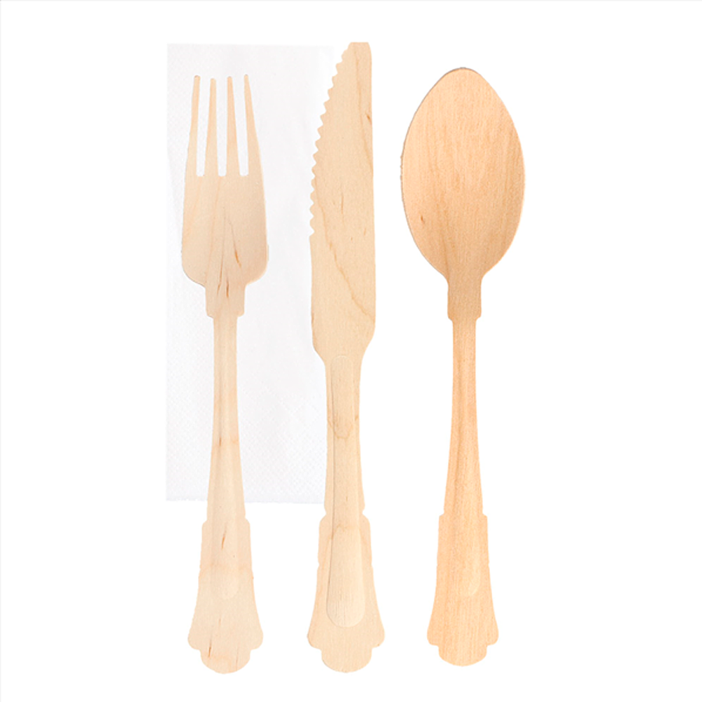 KIT TALHERES DE MADEIRA GARFO+FACA+COLHER+GUARDANAPO 20CM (EMBALAGEM PLÁSTICA)