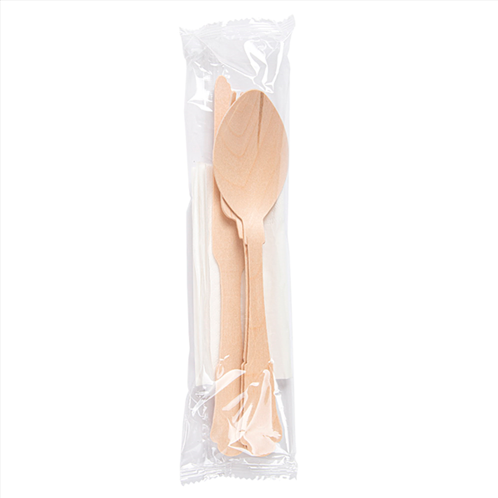 Kit talheres madeira com garfo, faca e colher de 20 cm, mais guardanapo, embalado individualmente em plástico. Oferece higiene, rapidez e apresentação consistente. A madeira natural assegura conforto, resistência e um visual elegante. É a solução prática e sustentável para take-away, eventos e catering.