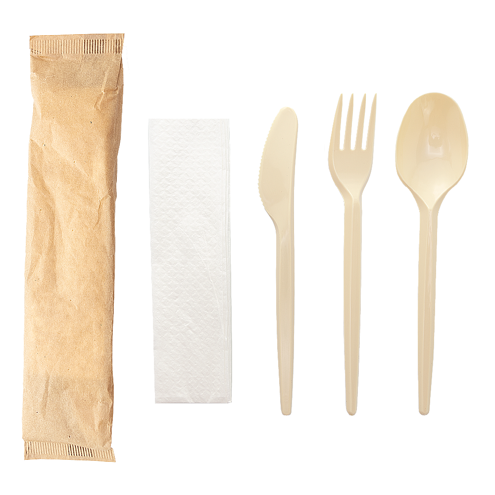 Composição: garfo, faca e colher reutilizáveis + guardanapo. Acondicionamento: saqueta de papel com embalagem individual. Utilização: restauração, take-away, catering, eventos e consumo em viagem. Características: resistente, leve, higiénico, reutilizável, de fácil transporte e com apresentação profissional.
