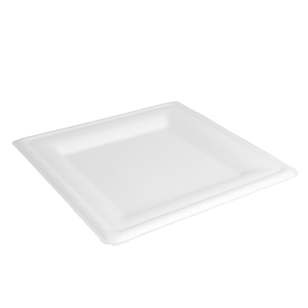 Dimensão: 20 cm (quadrado). Cor: branco. Material: bagaço de cana-de-açúcar. Tipo: descartável, biodegradável e compostável EN 13432. Propriedades: resistente a óleos e humidade; apto para contacto alimentar; intervalo de utilização aproximado −18 ºC a +100 ºC; apto para micro-ondas (curta duração); não apto para forno.