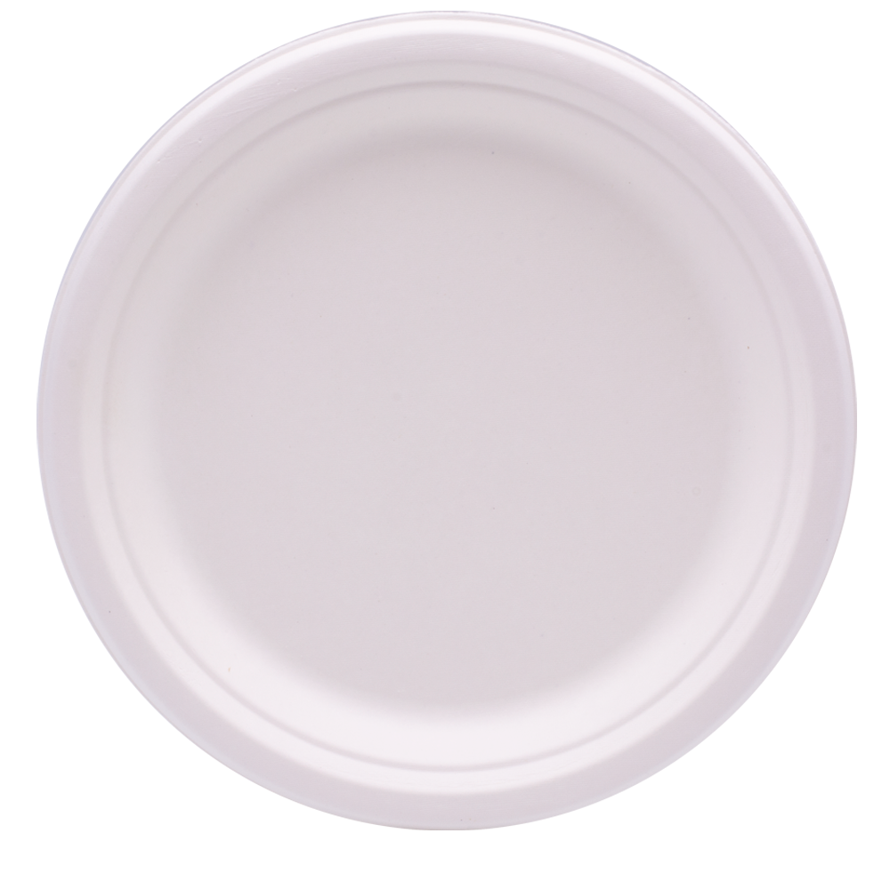 Diâmetro: 22 cm. Cor: branco. Material: fibra de cana-de-açúcar (bagasse). Tipo: descartável, biodegradável e compostável EN 13432. Propriedades: resistente a óleos e humidade; apto para contacto alimentar; intervalo de utilização aproximado −18 ºC a +100 ºC; apto para micro-ondas (curta duração); não apto para forno.