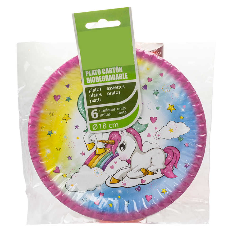 Este prato descartável unicórnio apresenta ilustrações vibrantes e detalhes que estimulam a imaginação, tornando cada refeição num momento ainda mais especial. Por outro lado, a qualidade do papel (cartão) garante resistência suficiente para suportar diferentes tipos de alimentos, sem rasgar ou deformar. Assim, cada convidado sente-se envolvido pela magia do tema, enquanto desfruta de maior conforto e segurança.